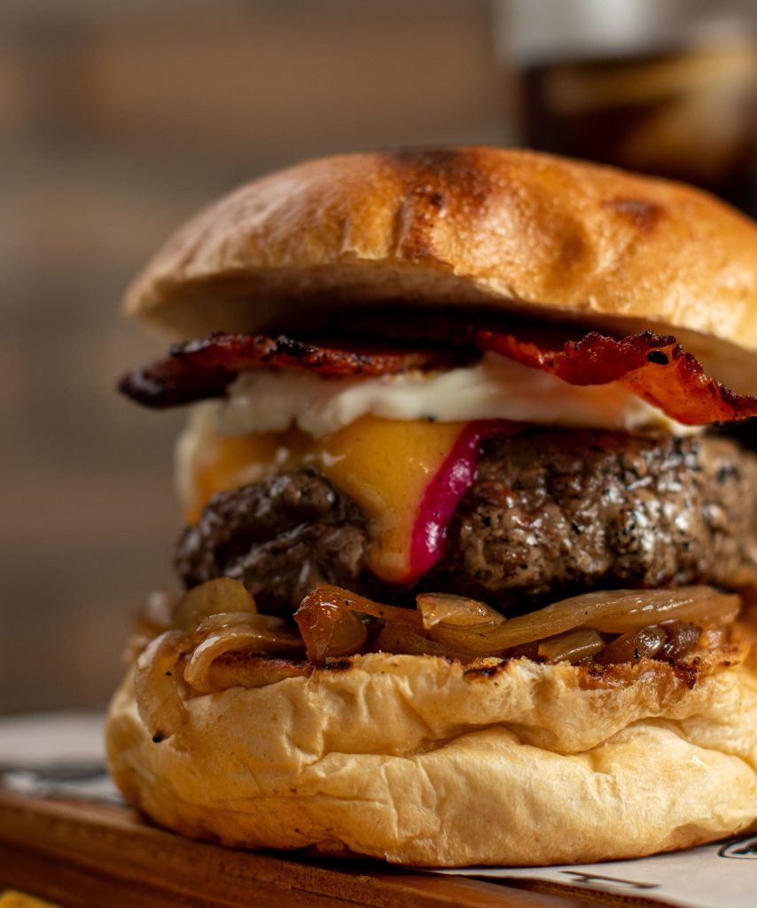 Burger artesanal de carne 160g, cebola caramelizada, queijo cheddar, bacon frito e molho barbecue. Um clássico cheio de atitude e sabor.